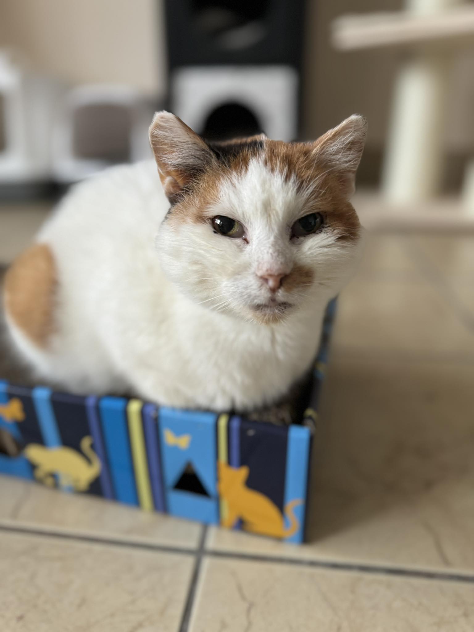 Cześć, jestem Kaczuszka! Większość życia spędziłam na ulicy. Gdy myślałam, że to już koniec, zjawiły się One. Ciocie znalazły mnie na śmietniku, pobitą, wygłodzoną, zarobaczoną, ze złamaną łapką. Z czasem przekonałam się do człowieków. Teraz jestem największą przylepą w kociarni, nie przepuszczę żadnej okazji do czułości. Codziennie witam wolontariuszy wchodzących do kociarni. Kiedyś musiałam o wszystko walczyć, dlatego teraz chciałabym mieć swojego człowieka na wyłączność.